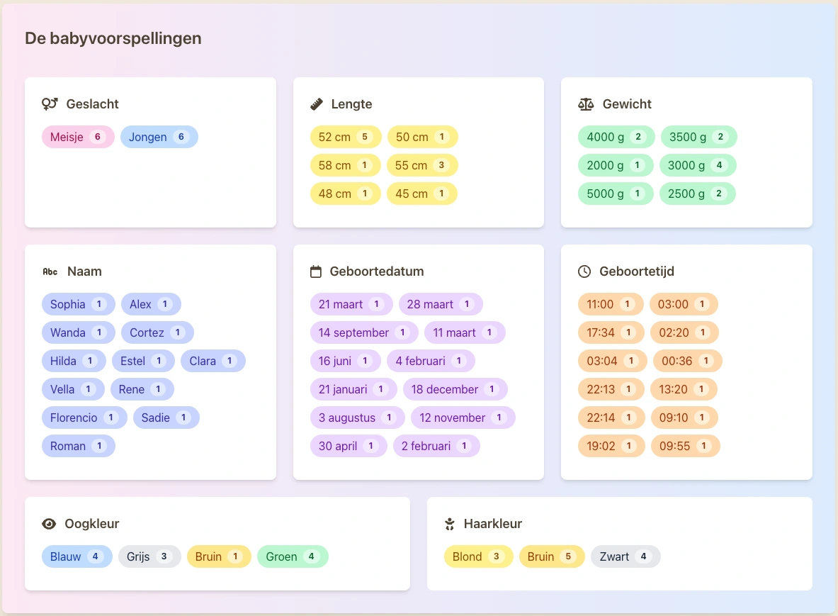 Crea in pochi clic un baby pool unico per la tua gravidanza. Personalizza le domande come sesso, nome, lunghezza, peso e altro. Scegli una foto di invito allegra e uno schema colori.